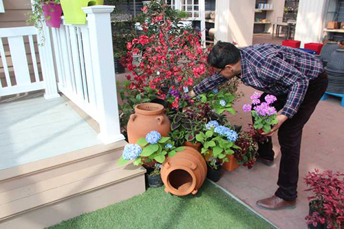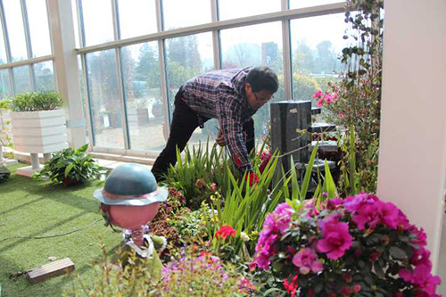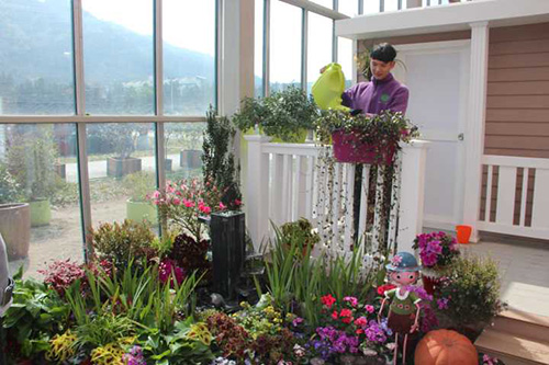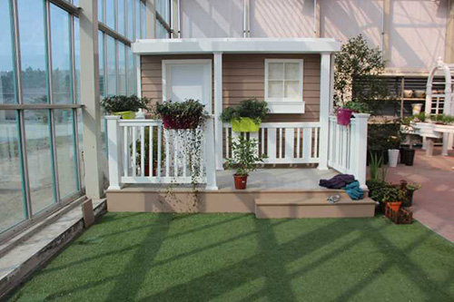 ▲我们选择园艺中心室内一处小木屋的阳台,作为造景点。园艺师现场查勘后,初步确定花境布置点的面积和风格。