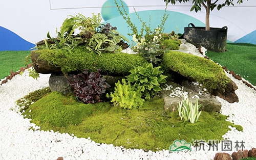 现场共布置了四个小场景,前方左侧以自然形状的植物造景为主,通过各种花开植物与常绿、色叶等植物的巧妙搭配,展现庭院中向阳处的植物应用和景观效果;前方右侧以各种塔形、圆形、方形、球形等造型植物为主,通过高低错落的有机布置,展现各种造型植物在景观中的应用效果;后方左侧以松磷堆叠出地形,用佛甲草围合,以金钟花、月桂等植物点缀,展示庭院一角的造景效果;后方右侧则是一处苔藓微景观,以白石子铺底,通过枯木、苔藓、矾根及丰富的蕨类植物等的搭配,配以起伏的地形,营造出一片宁静清新的小森林般的阴生景观。