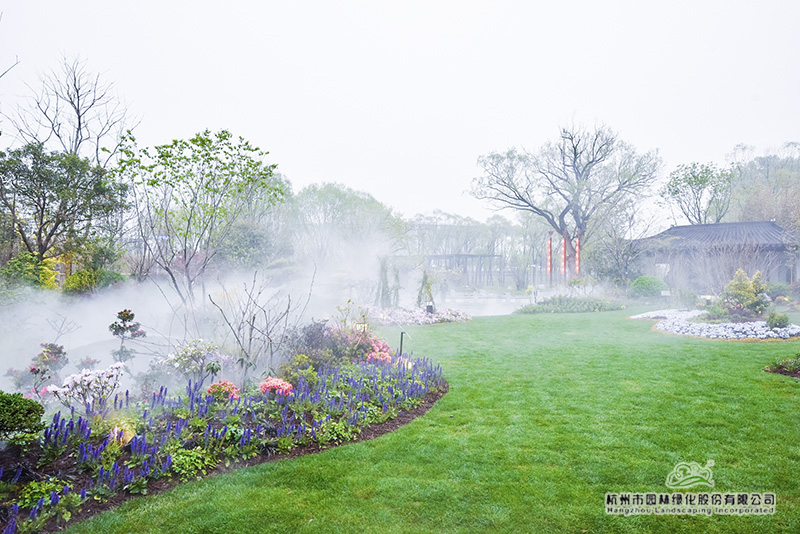 “延庆空气干燥,而浙江园内的植物,基本来自气候温润的南方,因此,如何有效保水和增加空气湿度,以此来提高植物的成活率和保证后期生长,是我们施工时必须要考虑的问题。”吴小成说,“所以,园内我们一共做了四套系统,大树根部的滴灌系统和树上的喷洒系统,大草坪的浇灌系统,以及针对全园的雾森系统。”