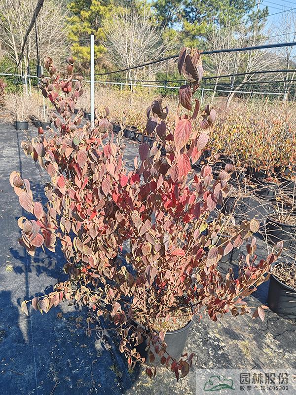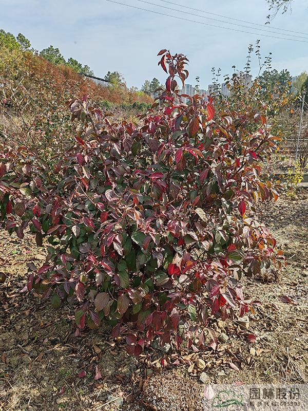 忍冬科荚蒾属,落叶灌木,全株被毛。花白色,量大,花期4月。果红色,量通常较小,果期10-12月。秋季叶色变暗红,通常11月开始变色,12月至次年2月达到最佳观赏效果。病虫害较少,生长速度快,且耐寒,通常雪期还未落叶。植株极耐修剪,适合工程应用或庭院观赏。